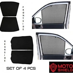 MOTO SHIELD Car Curtain increase ease of use. Material: Nylon Polyester Mesh with Metallic Frame.Color: Black Dimensions: Customized as per vehicle Mount type: Open the car door and place the sun shades inside on the window frame (metallic part). Note- The product will be fixed on the car window after opening the car door and not with the door closed. The product is fixed as end to end on the car window frame. Contents- 1 Set of 4pc (Front 2 pcs are Half Cut without zip For Side Mirror View, Rear 2 pcs are without zip)